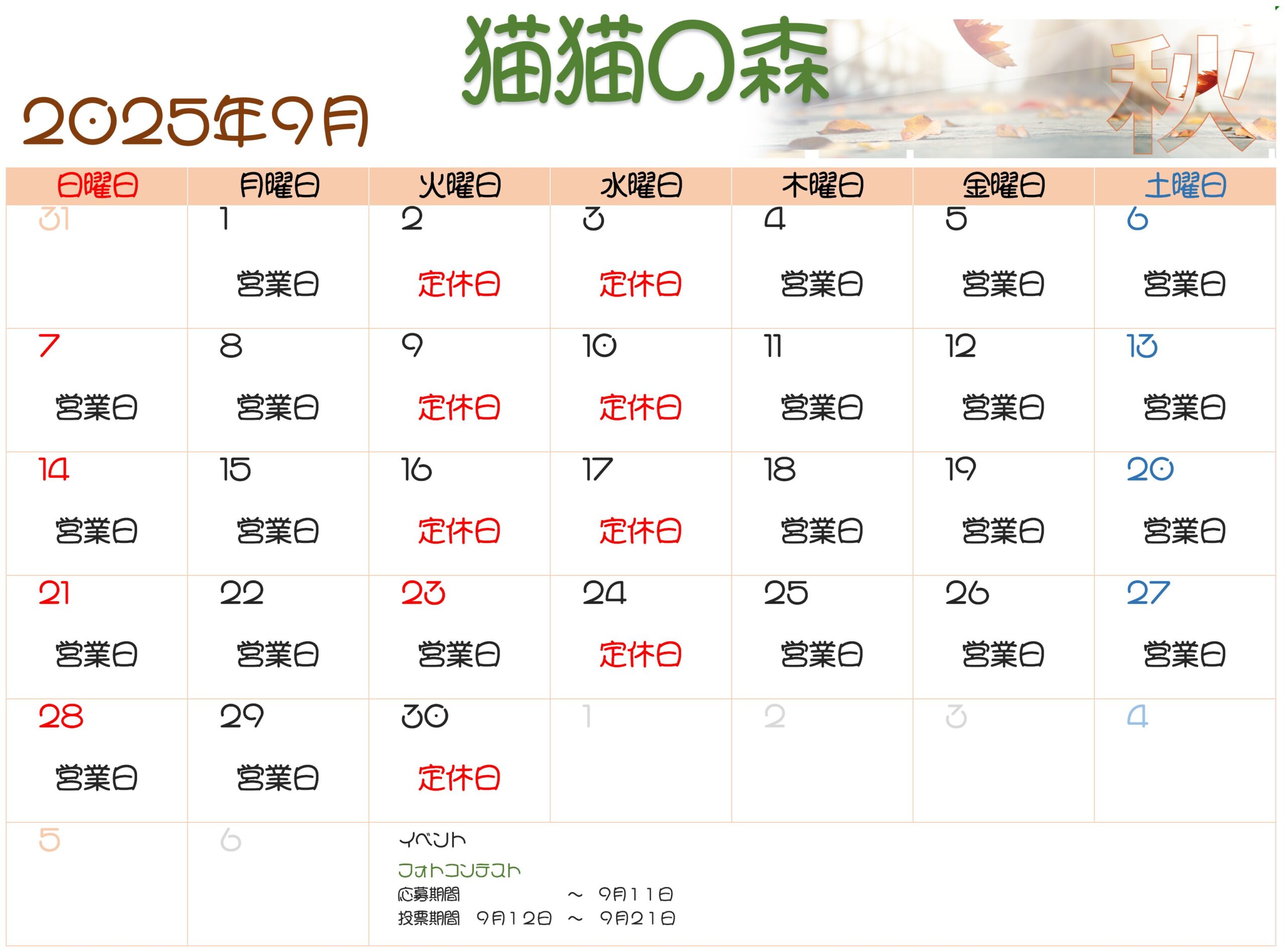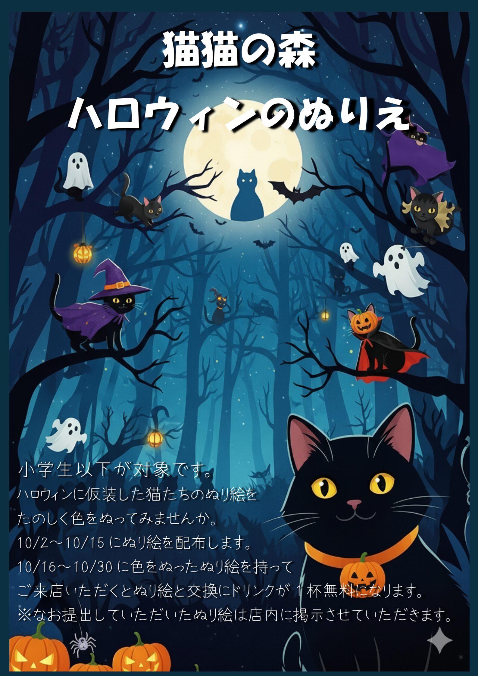 猫猫の森 ハロウィンのぬりえ 2025 9/29 猫猫の森 2025年9月29日 猫猫の森 にゃ~にゃクイズ この記事を書いた人 seishinkaiplus 関連記事 にゃ~にゃクイズ 2025年9月20日 電子マネー決済始めます 2025年8月31日 営業カレンダー 9月 2025年8月21日 猫猫の森、定休日変更のお知らせ 2025年8月14日 フォトコンテストを開催 2025年8月8日 ガレットラヴィとのコラボ企画 2025年7月27日 ポイントカード始めました 2025年6月29日 オープン前日 2025年5月21日 コメント コメントする コメントをキャンセルコメント ※ 名前 ※ メール ※ サイト 次回のコメントで使用するためブラウザーに自分の名前、メールアドレス、サイトを保存する。 上に表示された文字を入力してください。